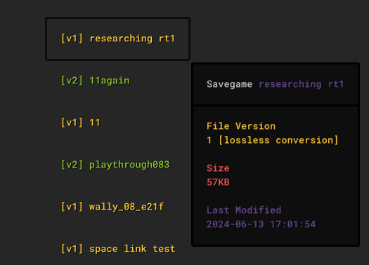 This is the first release utilizing savegame conversion. You’ll notice that savegames are now tagged with their ‘file version’ and are colored depending on whether they’ve been created with the same version or not.