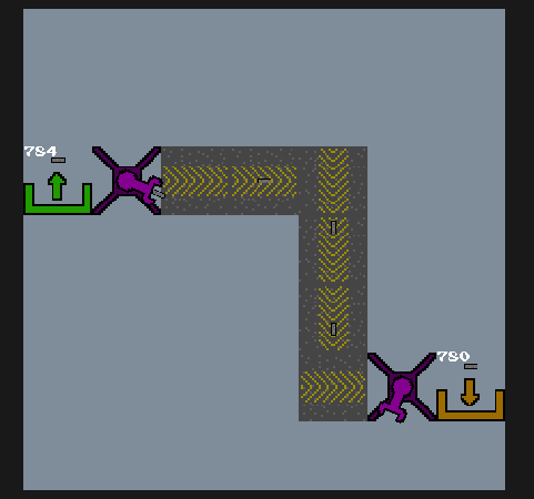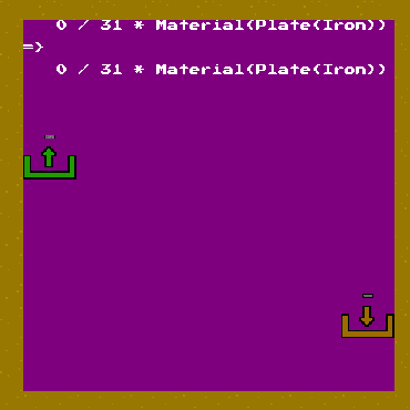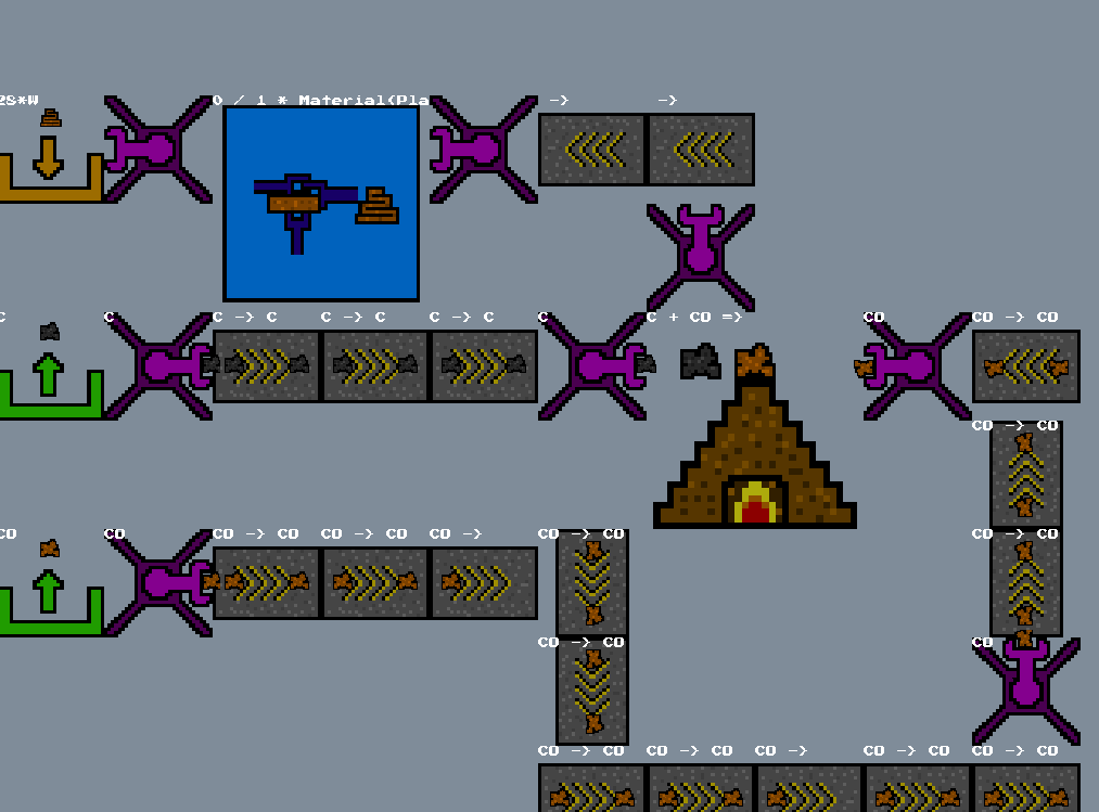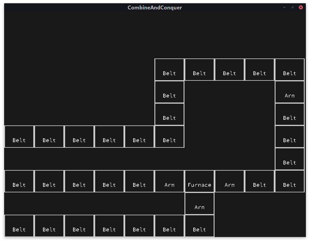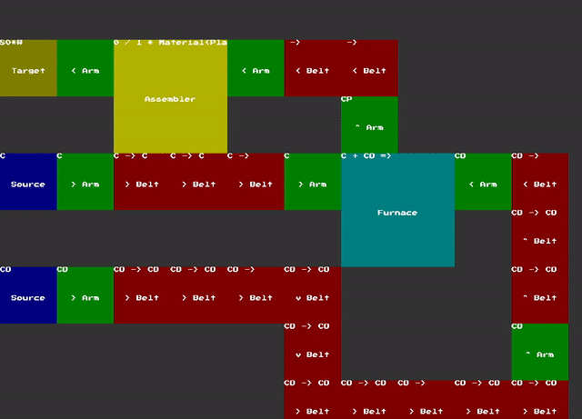 Since I had to implement the rendering myself, Factor Y started out as a console application that renders text to the console and parses text files for the initial state of the factory.