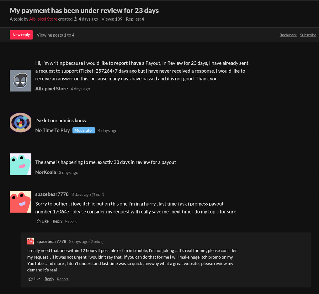 Me asking regarding my payout https://itch.io/t/4400512/payout-stuck-in-review-for-over-26-days
