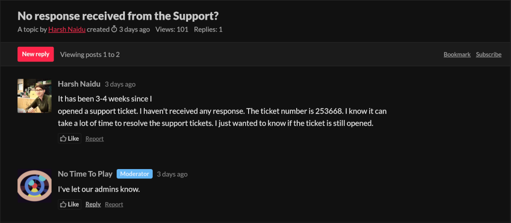 Harsh Naidu waiting for 3-4 weeks https://itch.io/t/4589429/no-response-received-from-the-support