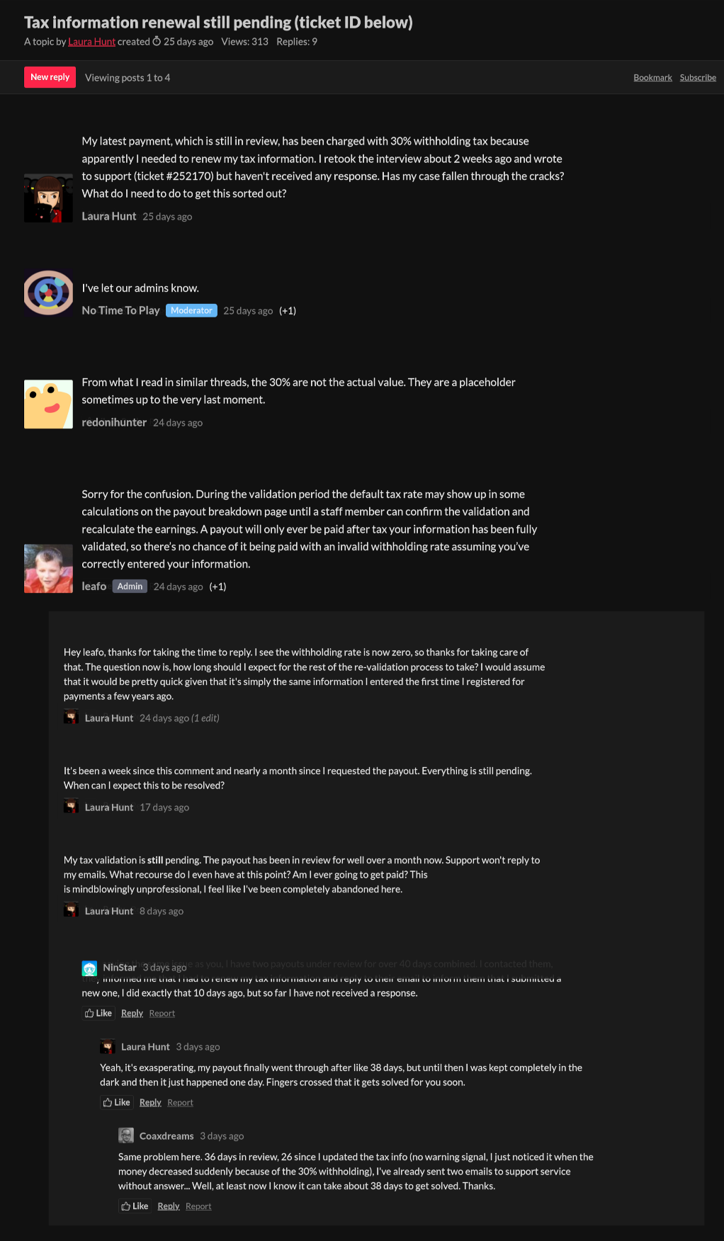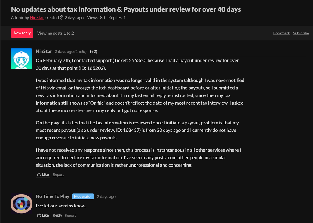 NinStar waiting for over 40 days https://itch.io/t/4594179/no-updates-about-tax-information-payouts-under-review-for-over-40-days