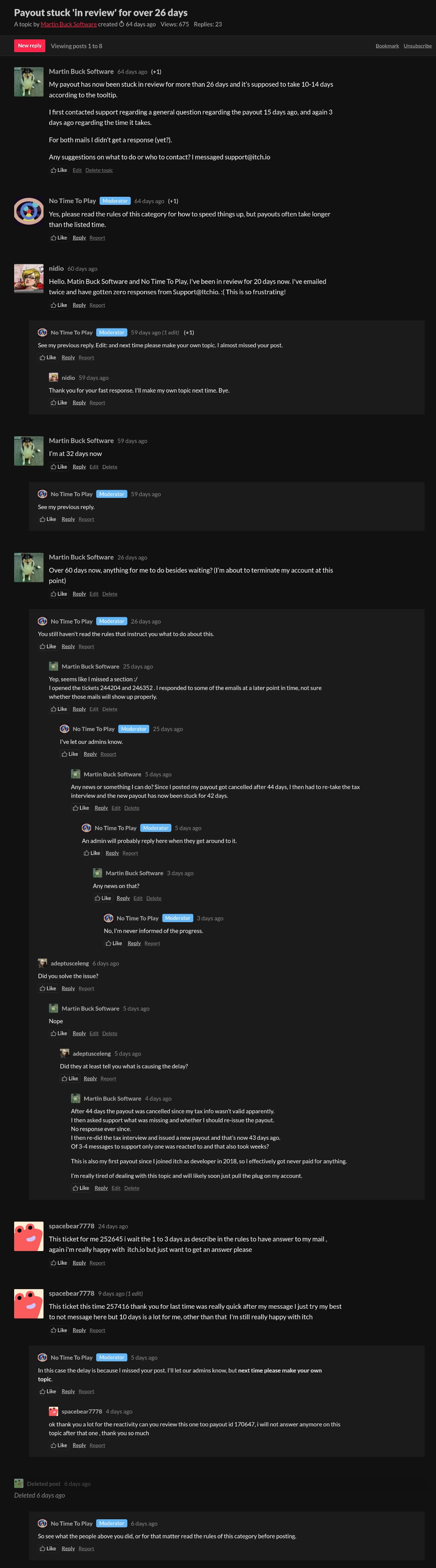 As you’ll also see in the post I mentioned above https://itch.io/t/4400512/payout-stuck-in-review-for-over-26-days I also contacted them via their forums, provided tickets / payout information and the ‘admins were informed’ about it.