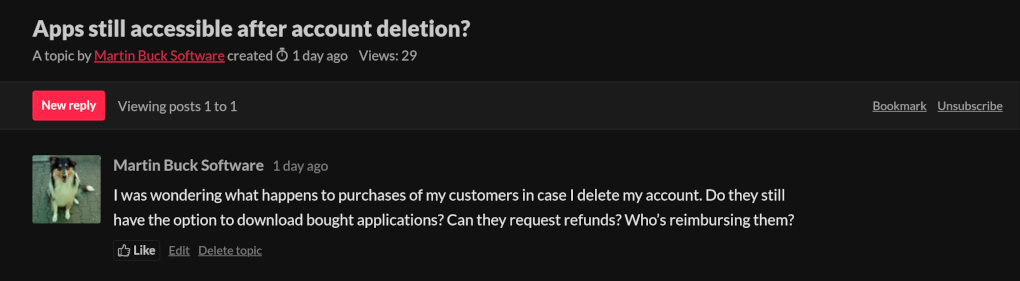 Note that I also tried to figure out what happens to my customers in case of an account deletion, with no response either: https://itch.io/t/4595678/apps-still-accessible-after-account-deletion
