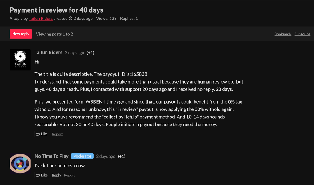 Taifun Riders 40 days as well https://itch.io/t/4593629/payment-in-review-for-40-days