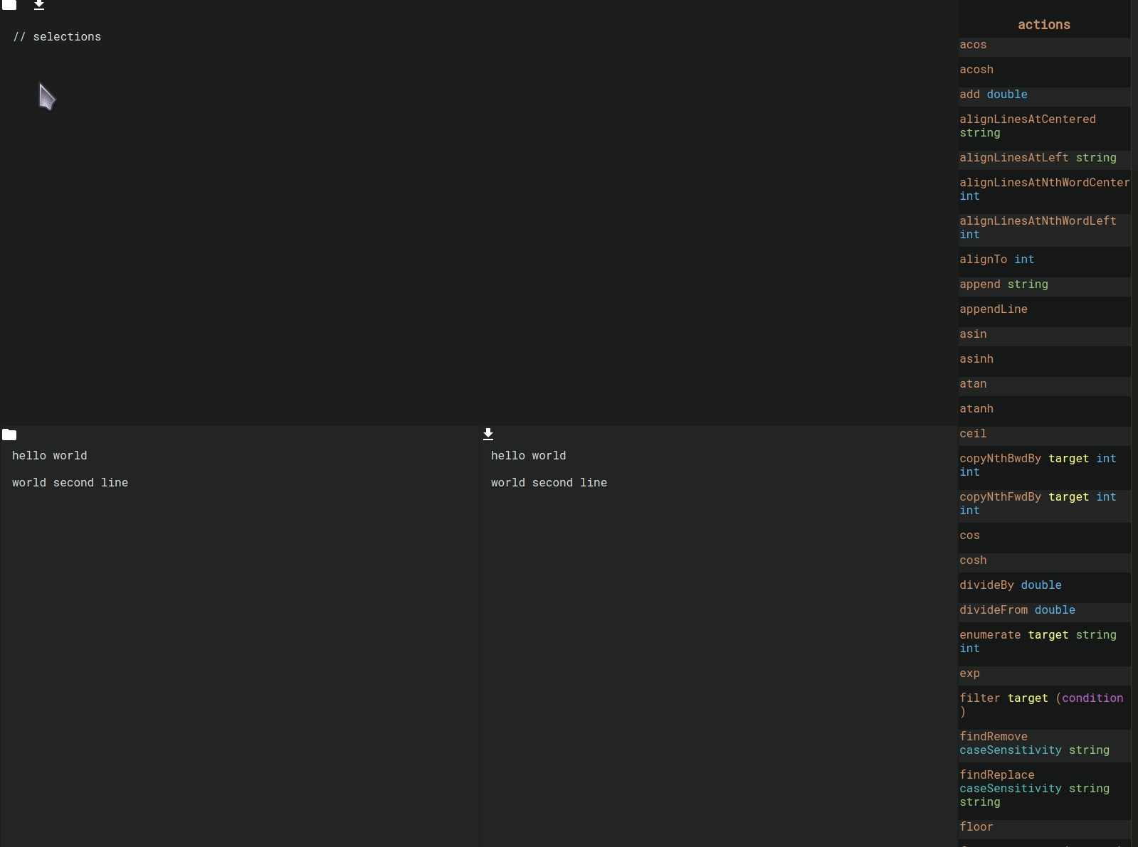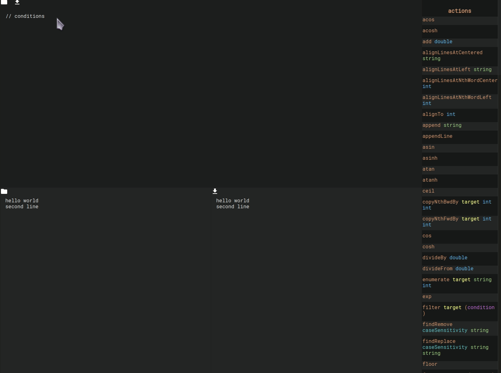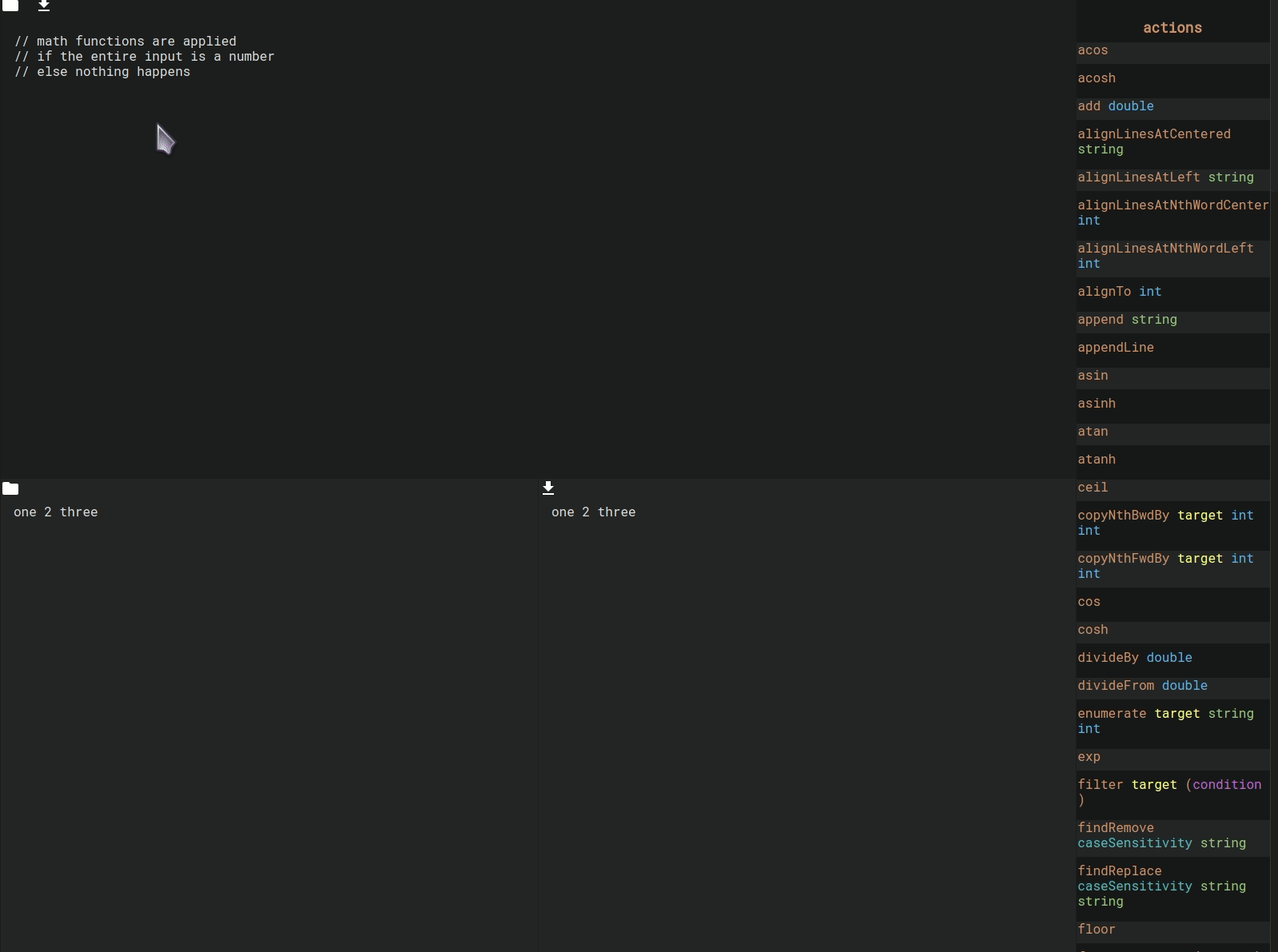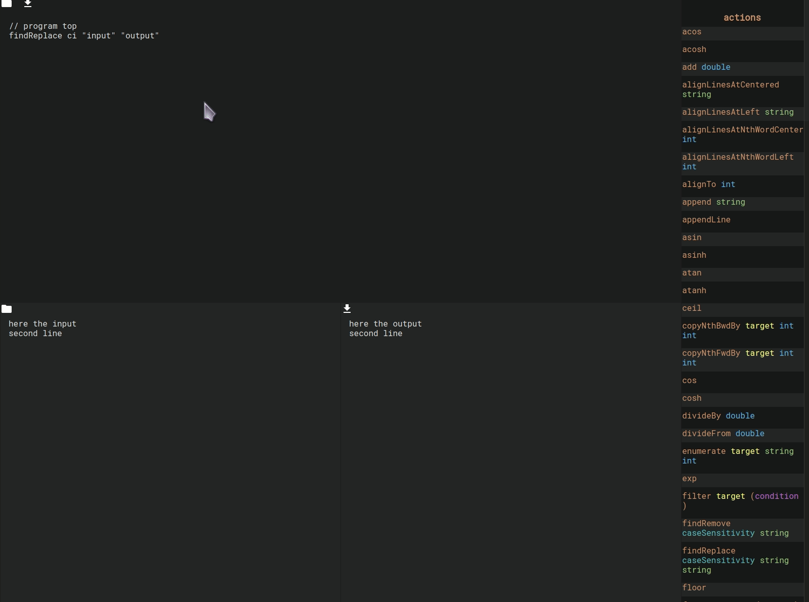 Actions directly alter the text. There’s actions to append text, align the input, sort it, move words, remove duplicates and much more.