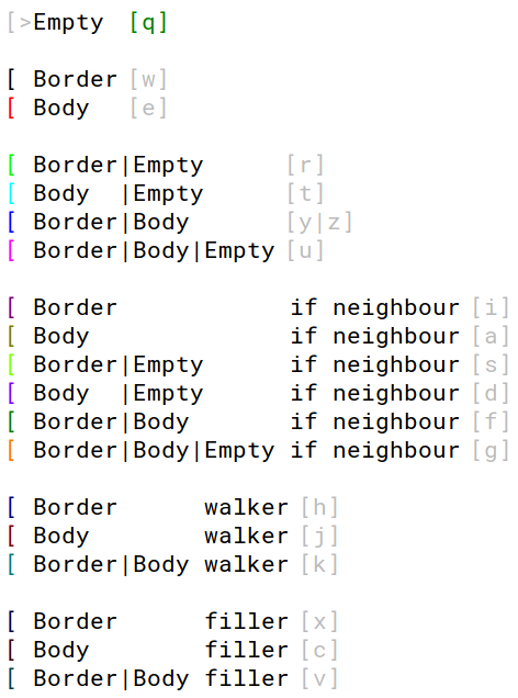 Border|Empty if neighbour will be Empty if it has no neighbour, otherwise there’s a 50% each for it becoming Border or Empty. These pixels can be used to toggle entire groups or have growing structures.